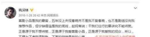 “春晚剧组很关心我们,给我们提供作品,但我觉得没有达到高度,和过去的作品对比后有差距。没拿出好作品上春晚才遗憾,宁缺毋滥,不能浪费观众时间,保护观众,也是保护小品”。