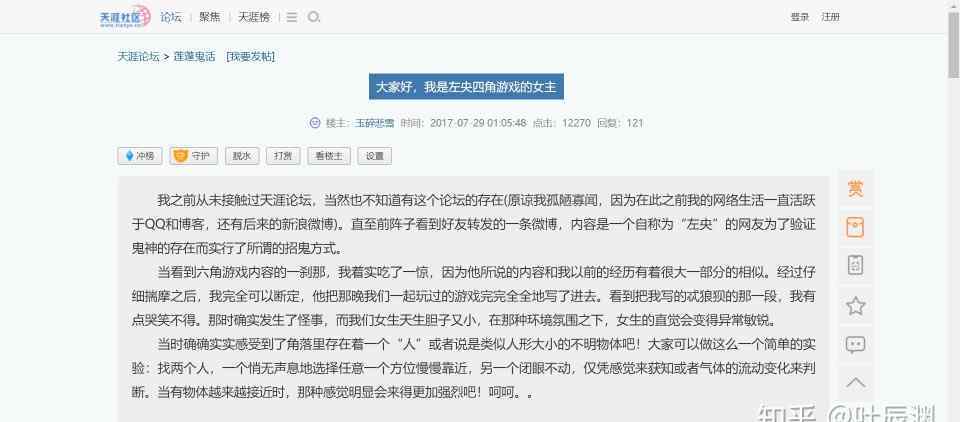 左杨描述的经历是真是假,大家自己判断。值得一提的是,2017年,天涯论坛又出现了一个叫“玉碎伤心雪”的用户,自称是左阳四角游戏的“少女”。大家好,我是左阳四角游戏的女主