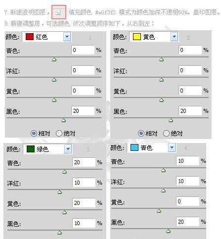 8,9.创建一个可选的颜色调整层来调整红色、黄色、绿色、青色、蓝色、洋红色、白色和中性颜色。参数设置如下。
