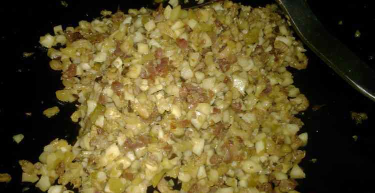 6 炒锅烧热,放少许油,先放入腊肉丁和虾米翻炒爆香,然后加入马蹄冬菇榨菜丁翻炒几下,倒两汤匙左右酱油,2g的盐,少许的五香粉,翻炒片刻,熄火装碗里