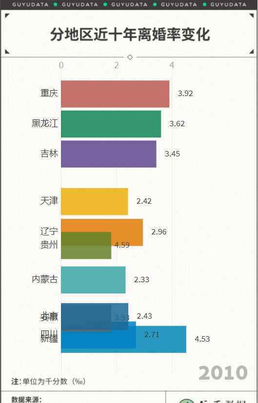 西南以重庆和贵州为代表,其中重庆以5‰的比例居全国第一。也就是那一年每一千个人,就有五对夫妻离婚。