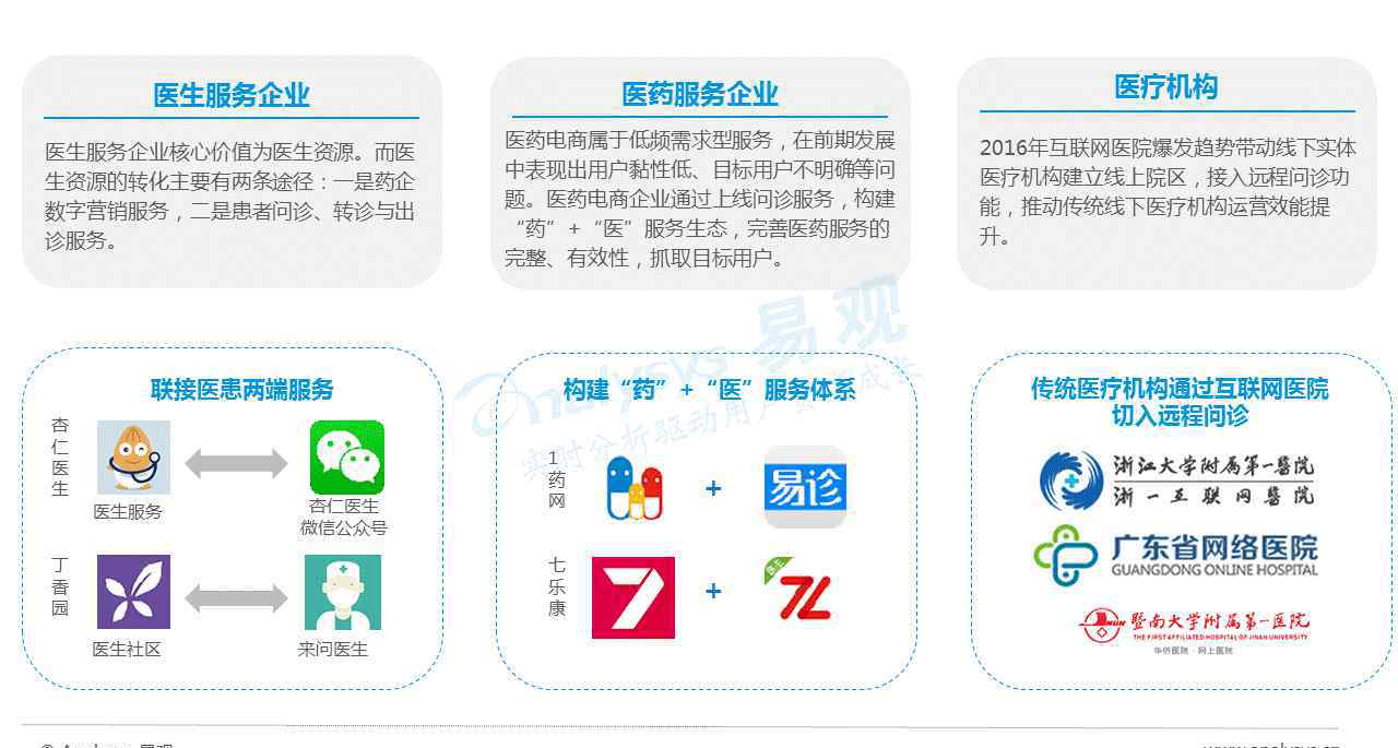 ⑦所有参与实体都相继推出网上咨询服务,网上咨询仍然是唯一成熟的互联网医疗服务