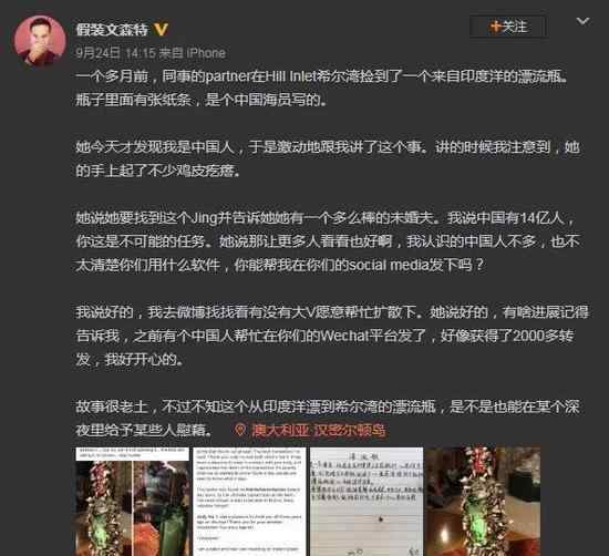 只有一个名字,网友的追踪计划能成功吗?帮助凯特发微博找人的中国朋友28日晚又发了一条微博,满怀期待的朋友可能会失望:漂流瓶的主人找到了,但故事的结局并不幸福。主持人拒绝透露更多细节。