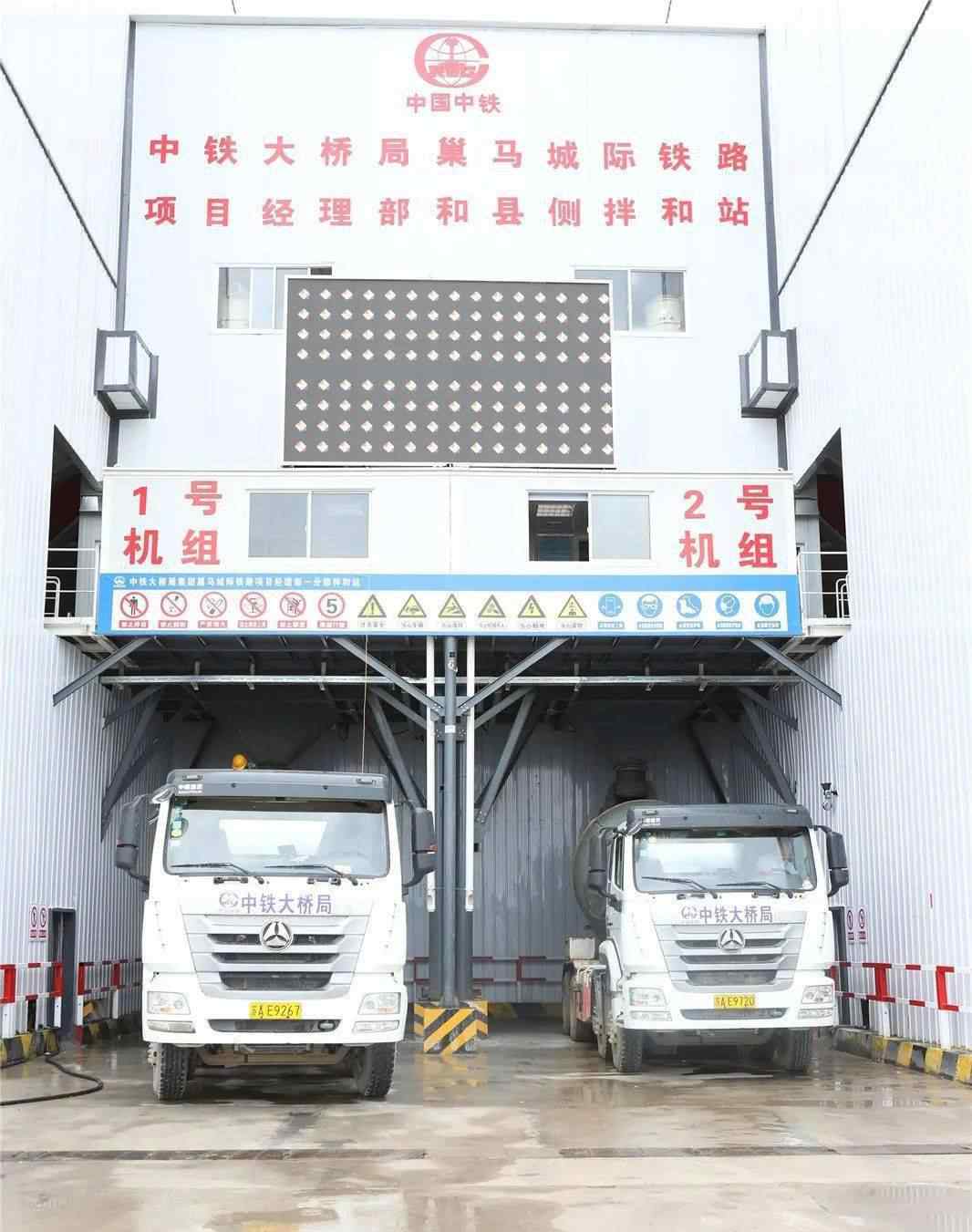 ▲全封闭混凝土搅拌站已试运行,混凝土搅拌车来回穿梭。