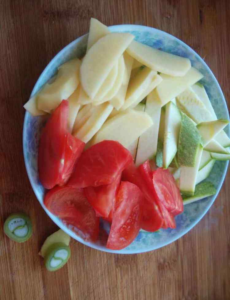 2 西葫芦,西红柿洗好 切片,土豆削皮洗好切片,葱姜切好