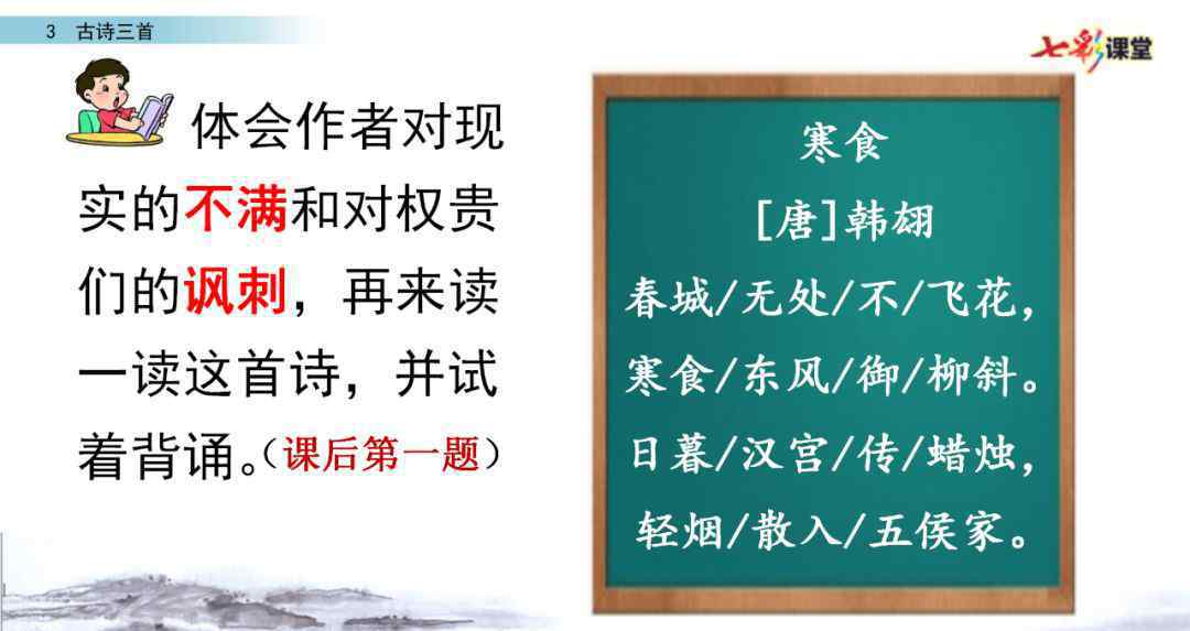 诗的前两句写的是白天,后两句写的是夜晚:“夕阳西下,汉宫内烛火铺开,轻烟散入武侯家。”“日落”是傍晚。“汉宫”是指唐朝的皇宫。“五侯”一般指东汉时同一天被封侯的五个宦官。这里借用韩玉堂的意思是指自中唐以来一直受皇帝宠爱和压制的宦官。这两句话的意思是,寒食节那天家家不能生火点灯,但皇宫是个例外。天黑之前,宫殿里正忙着分发蜡烛。除了皇宫,你最亲近的奴才也能得到这种恩惠。诗中用“传”和“三”形象地描绘了夜晚走着走着路过蜡烛的画面,让人看到蜡烛的光,闻到淡淡的烟味。在我国禁止冷食生火是一个由来已久的习俗,但有权有势的大臣可以破例放蜡烛。诗人对这种腐败的政治现象进行了委婉的描述。