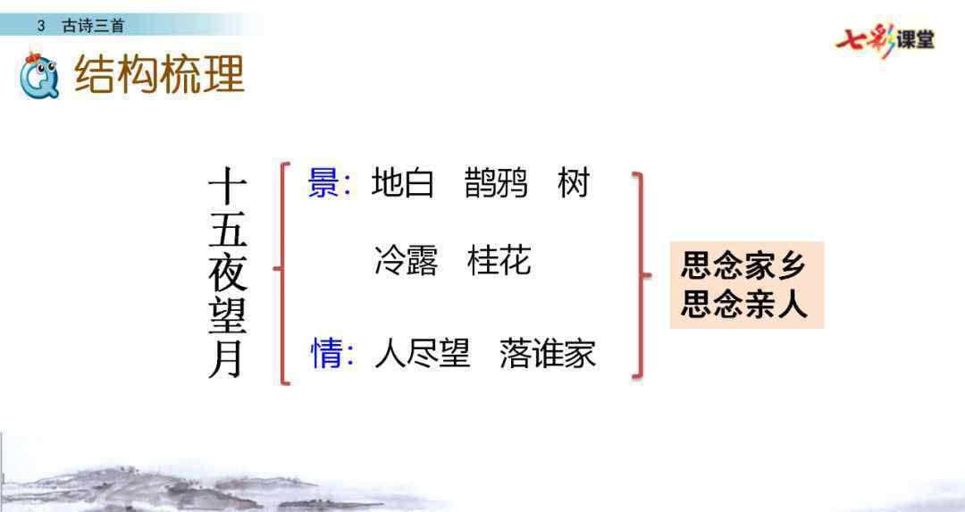 《十五夜望月》中每两句都有一层含义,写中秋月色和望月心情,展现一幅中秋之夜孤独、寒冷、宁静的画面。这首诗以描写风景开始,以抒情结束,想象力丰富,韵味无穷。