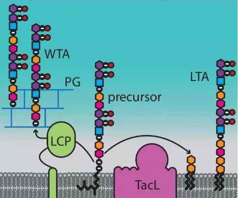 然而,膜磷壁酸的形成是由一种叫做TacL的酶控制的[7]。如果TacL不在了,就无法形成膜磷壁酸,同时大量合成了另一种叫做细胞壁磷壁酸(WTAs)的物质。而这个细胞壁磷酸蛋白酸还可以固定肽聚糖水解酶,使肽聚糖水解酶固定在细胞壁上,开始降解细胞壁上的肽聚糖。