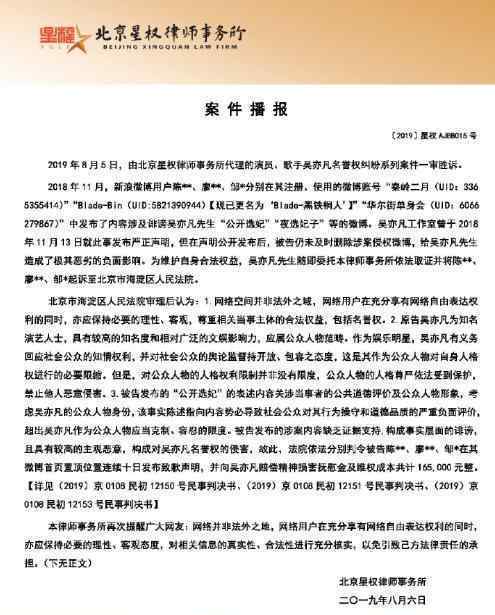 8月6日,北京兴泉律师事务所发布案情报告,一审胜诉吴亦凡三起名誉纠纷案件。被告因在吴亦凡发表“公开选妻”等诽谤性内容,被判处向吴亦凡公开赔礼道歉10天,赔偿精神损失费和维权费用共计16.5万元。此外,吴亦凡的其他权利保护案件也正在依法进行。