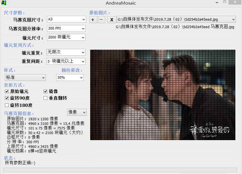 马赛克尺寸是设置主图分成多少个马赛克,和小图一起做成一个主图。这里我设置了2000个马赛克块。