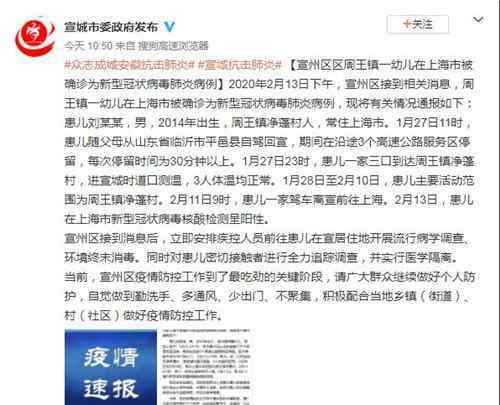据宣城市人民政府15日官方微博消息,2月13日下午,宣城市宣州区接到相关消息,纣王镇一名儿童在上海被确诊为新型冠状病毒病例。