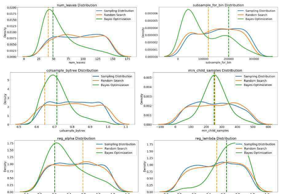 现在我们有了这些结果,我们可以在贝叶斯优化中查看所有参考分布、随机搜索和数值超参数。垂直虚线表示每次搜索都是超参数的最佳值: