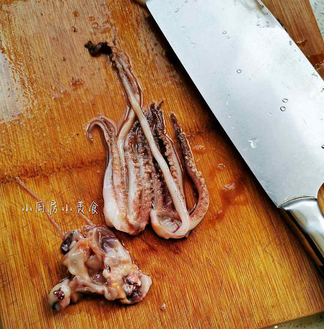 第八步:撕下薄膜后,将鱿鱼须一根一根剪掉,将鱿鱼身体部位切成刀状,然后切成小块。