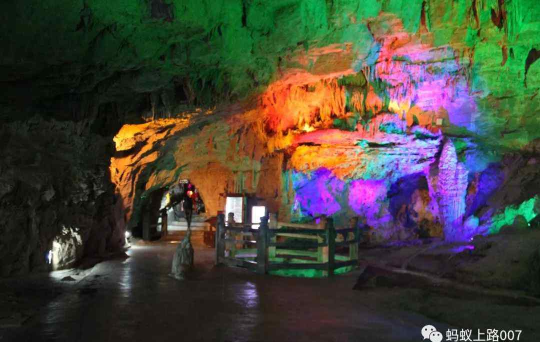 当你一直向左走,过桥时,五彩缤纷的洞穴奇观出现在你面前,你心中的恐惧消失了。在仙境般的奇石世界里,你向前向上游走,很快就来到了一个宽阔的地下广场——狮子堂。