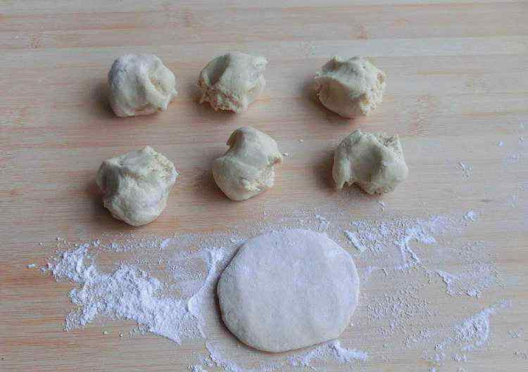 4 把面揪成大剂子,在面板上按成中间厚边上薄的面皮