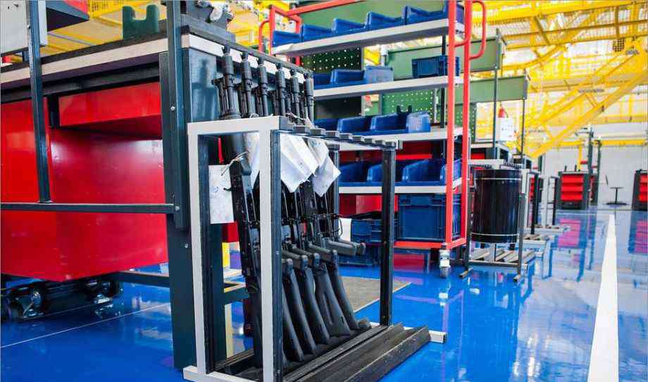 图为车间一角,已装配好的多支AK步枪整齐排放在枪架上等待验收。