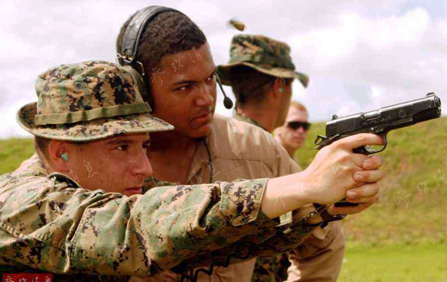 图为2014年1月,使用M45手枪进行打靶训练的美军陆战队士兵。