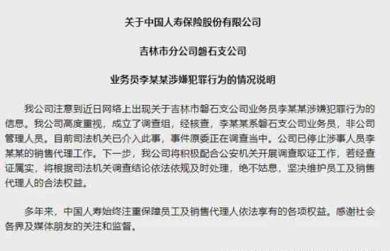 近日,有网友爆料中国人寿吉林磐石分公司高管6次强奸女员工,爆料人是事件受害者。该网友称,该高管还与其他员工发生了不正当的性关系,女员工不仅没有报警,还争宠。目前,中国人寿尚未对此事做出回应。