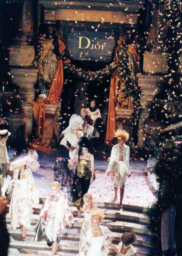1998年春夏的迪奥歌剧院系列可以说是给了观众一场视觉盛宴,或者说迪奥是海盗时代最美的,秀在冷艳豪华,醉在金钱。海贼秀是虚幻的梦。模特们戴着宝石项链、束腰裙、饰有羽毛的外套和帽子,甚至还有手指间飘动的头发。每个细节都值得细细品味。