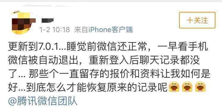 某网友:更新到7.0.1...睡前微信正常,早上看到手机微信就自动退出。再次登录后,聊天记录不见了...我应该怎么处理我一直保存的报价和资料...怎样才能恢复原始记录?