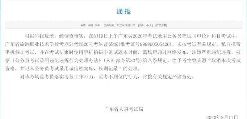 根据举报反映,经调查核实,在8月9日上午广东省2020年考试录用公务员笔试《申论》科目考试中,广东省旅游职业技术学校考点54考场20号考生曾某源,未按考试有关规定,私自携带手机参加考试,并在考试结束时使用手机拍摄申论试题本封面,离场后通过网络发布,涉嫌严重违纪违规。根据《公务员考试录用违纪违规行为处理办法》第八条规定,给予考生曾某源“取消本次考试资格,并记入公务员考试录用诚信档案库,长期记录”的处理。