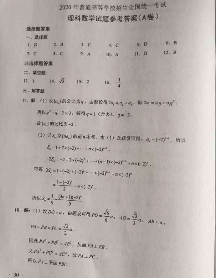 2020河南高考数学真题试题 全国卷1河南理数答案