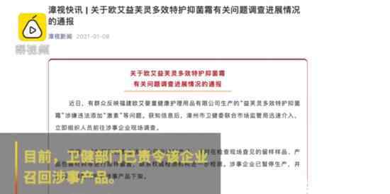 通报称,近日,有群众反映福建欧艾婴童健康护理用品有限公司生产的“益芙灵多效特护抑菌霜”涉嫌违法添加“激素”等问题。获知信息后,漳州市卫健委联合市场监管局迅速介入,立即组织人员前往涉事企业现场调查。