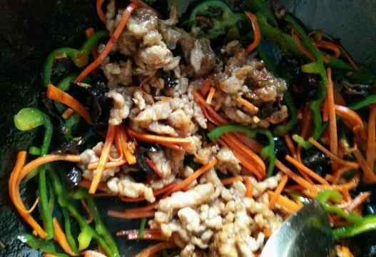 肉丝加半勺淀粉,把握好。如果是干的,可以加点水。