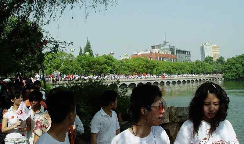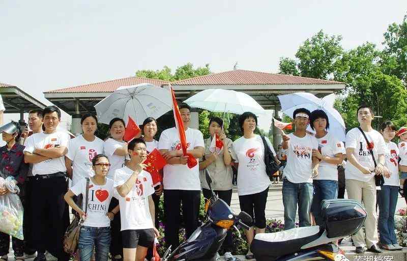 当奥运火炬传递来到安徽师范大学校门前美丽的镜湖时,近7000名师生挥舞着中国国旗和奥运五环旗,为奥运和北京齐声欢呼。