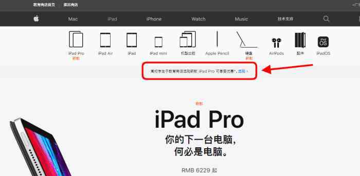 先说一下教育优惠入口。目前苹果官网已经把大幅跳转链接图片挂出来,进入苹果官网后在产品分类展示下方,有一行小字显示:高校学生于教育商店选购新款可享受优惠,点击选购进入优惠购买页面!
