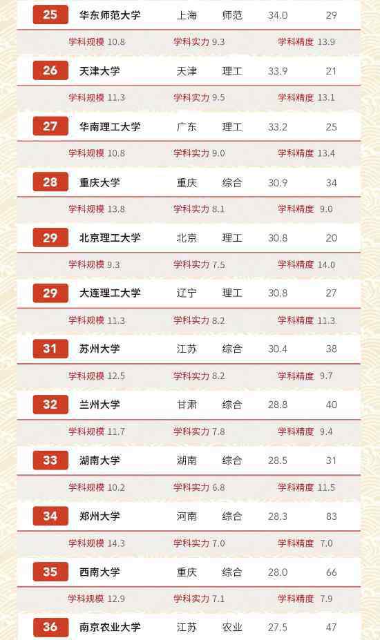 31-40名排名:苏州大学、兰州大学、湖南大学、郑州大学、西南大学、南京农业大学、华中农业大学、北京交通大学、南京师范大学、上海大学。