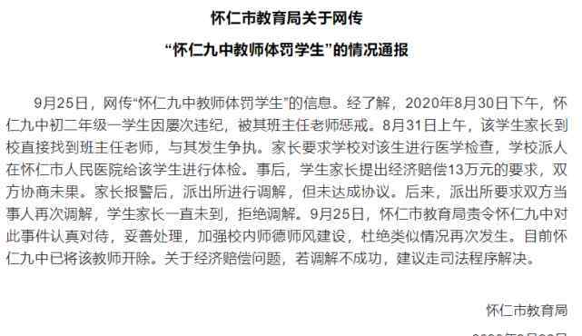 《通知》提到,9月25日,“怀仁九中老师体罚学生”的信息在网上传播。据悉,2020年8月30日下午,怀仁九中初二年级学生因多次违纪被班主任处分。8月31日上午,该学生家长直接去学校找班主任,与他发生争执。家长要求学校给学生体检,学校派人到怀仁县人民医院给学生体检。事后,学生家长要求经济赔偿13万元,双方协商无果。父母报警后,派出所进行调解,未达成一致。后来派出所又要求双方调解,但学生家长始终没到,拒绝调解。9月25日,怀仁县教育局责令怀仁九中严肃对待此事,妥善处理,加强学校师德师风建设,防止类似情况再次发生。目前怀仁九中已经开除老师。关于经济赔偿问题,如果调解不成,建议走司法程序。
