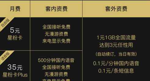 明星粉卡每月5元租,全国免费接听,来电显示免费;星粉卡Plus每月租金35元,含国内语音500分钟,全国免费接听,免费来电显示。星粉卡是日常租赁卡,1元全国流量1G,3元可以任意使用。套餐外,0.1元/分钟国内语音,0.1元/条短信。