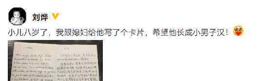 10月10日晚,刘烨与妻子上传一条手写信息给儿子伊诺,称:“孩子八岁。我和老婆一起给他写了一张卡片,希望他长成小男子汉!”消息分为中文和法文。信中说,伊诺是一个热爱学习、懂得照顾妹妹、尊重父母的人。他总是控制不住自己的手机和游戏,希望能控制自己,进步。我之所以用手写留言,是想记住,不管我多大,我永远是个好孩子。
