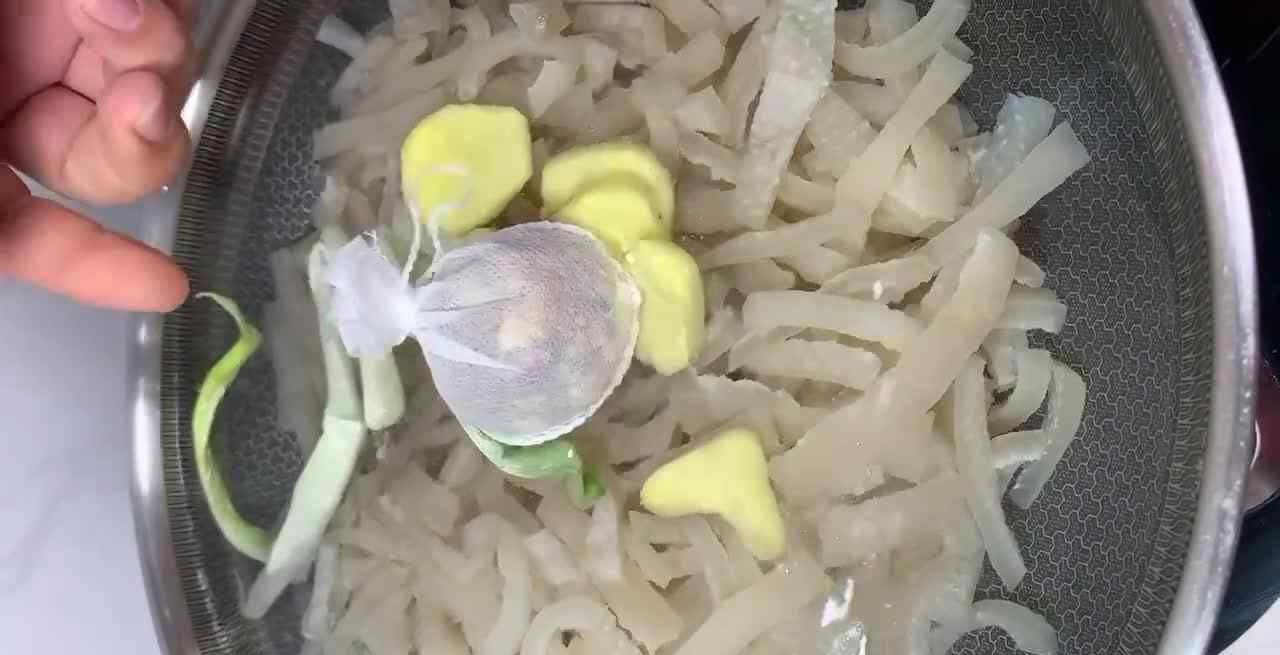 大多数人做不出猪皮的主要原因是猪皮没有洗干净。这个过程分为几个步骤:第一,把猪皮上的毛烧掉;第二,热烫后,一定要去除多余的油脂;第三,洗猪皮时,记得加入适量的盐、白醋和小苏打用力搓。切成细丝后,用冷水浸泡1-2分钟。