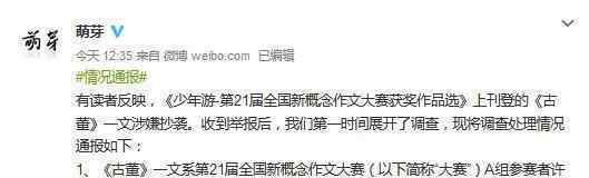 近日,有网友举报《博古》发表在《第21届全国新概念作文大赛青年巡礼选编》上的文章涉嫌抄袭。接到报告后,《萌芽》杂志也在第一时间展开调查。