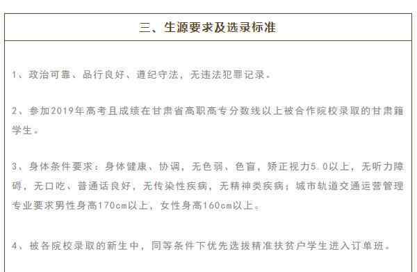 为了加快兰州轨道交通运营人才梯队建设,打造一支高标准、高水平、高素质的运营人才队伍。2019年,兰州轨道交通有限公司继续加强与省内外轨道交通特色院校的合作,选择5所具有轨道交通特色的高职院校开展校企联合办学,采用订单式校企合作模式,招聘一线技能型员工230人。现将合作院校、招生专业及生源情况公告如下: