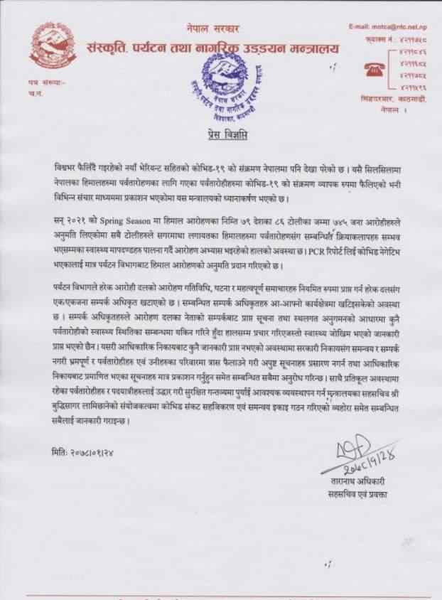 尼泊尔文化、旅游与民航部要求媒体不要发表未经官方机构证实的报道,不要在没有和官方机构沟通协调的情况下随意发表言论,不要给登山者和他们的家庭带来伤害。