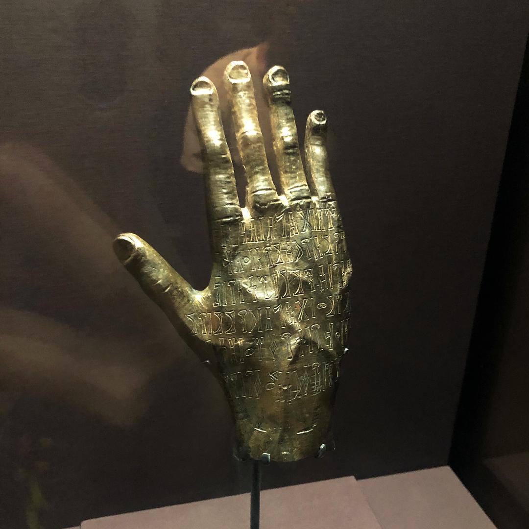 这只手,和真人手掌大小相同,骨骼、血管甚至手指关节上的皮肤褶皱,都和真人的手掌无异,这是用一只男人的右手开模锻造而成的铜手,也许是死后被截下,但也许来自手掌主人的生前。在青铜手的手背上,刻着古老的铭文,是古也门文字,记录着手的主人名叫瓦哈比·塔拉布,生活在距离我们1700年前,他把这只手供奉给一位名叫塔拉布·利亚姆的神,和手的主人同名的神。为了祈求神的庇护,因此将右手奉上,再由能工巧匠以手为模使用失蜡法用铜铸成供奉给神。