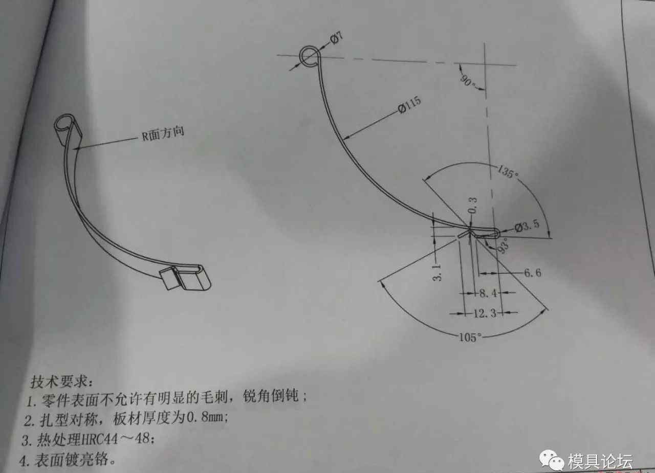 零件的宽度等于直接条的尺寸。中间第一个大圆弧预弯切断,圆弧中间用卡簧夹紧。当模具表面打开时,它会返回到第二个工作位置,既可以用作夹具,也可以用作浮动销!具体我说不上来。这是我去别人工厂看他们产品的时候看到的!那种材料本来是不锈钢做的,然后用不锈钢铁偷的,毛刺要求高就不行了。