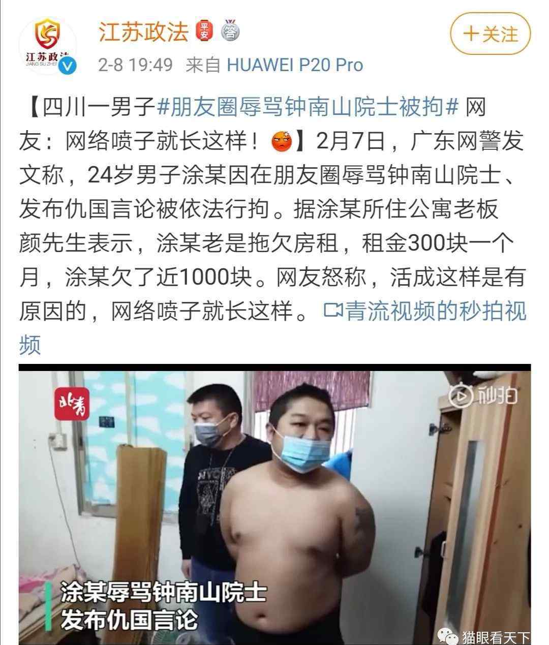 2月7日,公开侮辱钟南山院士并在网上发表仇恨言论的网络喷射器被广东警方依法拘留。据报道,这位24岁的涂姓男子因拖欠租金而感到不满。他在朋友圈发侮辱性言论,仇恨国家,被网友举报,被警方拘留。