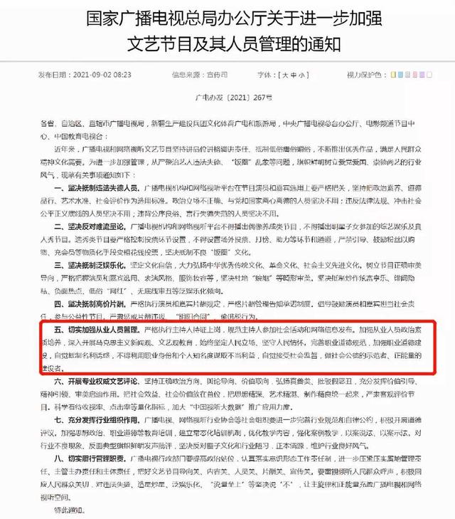 9月2日,广电发布了《进一步加强文艺节目及其人员管理的通知》,其中第5条是严格的加强从业人员的管理,严格执行主持人持证上持证上岗,规范主持人参加的社会活动和网络信息发布。