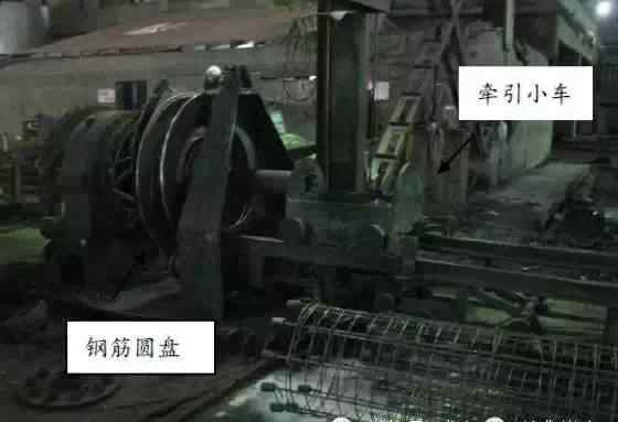 钢筋笼绑扎机如图2所示。处理过的主筋被装载在捆扎机拉伸小车的圆盘上。小车可以在图中的横向导轨上移动,以满足不同桩长钢筋笼的需要。箍筋放置在捆扎机中的圆盘上,小车以固定的速度移动,圆盘上的钢筋不断缠绕在主筋上,形成钢筋笼。