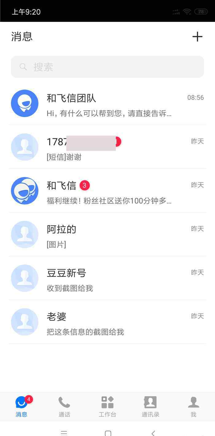 而飞信界面简单,按照功能分为“留言、通话、工作台、通讯录、我”,与普通即时通讯软件相比,突出了通话和工作台。