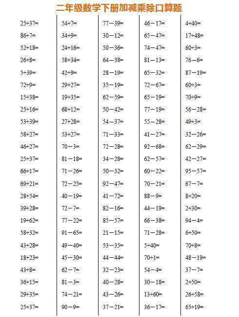 1.《二年级下册口算题大全800题加减乘除 (每日一练)二年级数学下册加减乘除口算题,给孩子打印一份!》援引自互联网,旨在传递更多网络信息知识,仅代表作者本人观点,与本网站无关,侵删请联系页脚下方联系方式。