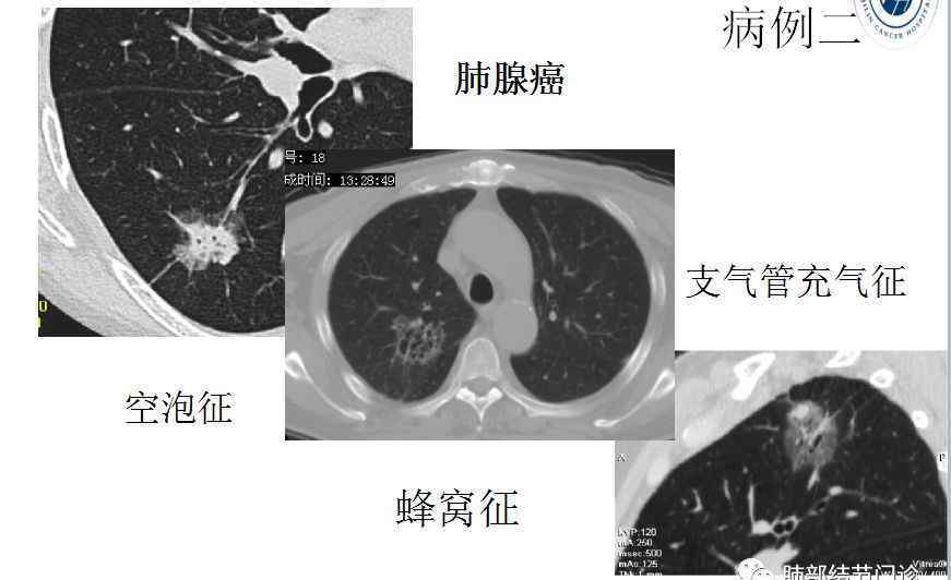 内部成分:主要恶性表现为病灶内的现实成分、荷包蛋征、空气泡征、蜂窝征、分支气管充气征。