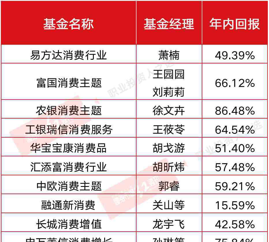 在消费类基金排行榜前端,《红周刊》记者发现突出的特色就是多位新锐基金经理冲在了前列,而我们耳熟能详的萧楠、李琛、肖肖、王宗合、谭丽等人执掌的产品年内业绩表现大多不温不火。具体来看,在今年迄今消费主题业绩超过80%的基金掌门人中,徐文卉、韩威俊、孙轶佳、王斌基本上是基民所不熟悉的名字,他们目前的岗位任职年限基本在4年以内,尤其是华安王斌的资历最浅,目前的岗位任职时间大约为2年零11天。