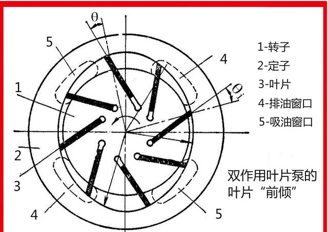 叶片安放角:叶片在工作过程中,受离心力和叶片根部压力油的作用,使叶片和定子紧密接触。当叶片转至压油区时,定子内表面迫使叶片推向转子中心,它的工作情况和凸轮相似,叶片与定子内表面接触有一压力角,且大小是变化的(其变化规律与叶片径向速度变化规律相同-即从零逐渐增加到最大,又从最大逐渐减小到零)。因而在双作用叶片泵中,将叶片顺着转子回转方向前倾一定角度,使压力角减小,从而可以减小侧向力,保证叶片在槽中移动灵活,并可减少磨损。当叶片有安放角时,叶片泵就不允许反转。以下两图是单作用叶片泵和双作用叶片泵中,叶片的倾斜对比。