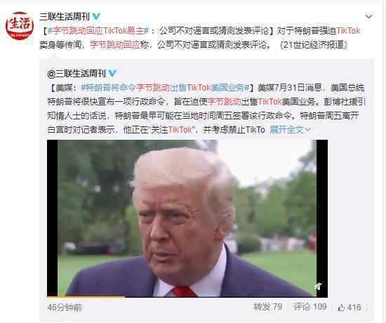 字节跳动对TikTok改变所有权做出了回应