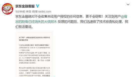 上线”图片助手”小功能原本是希望优化用户体验,但是却给用户带来了不良感受。我们向大侠阿木的监督表示感谢,也对广大用户致以歉意。京东金融App目前已暂时下线”图片助手”小功能,待进一步改进用户安全体验后再上线,也欢迎广大用户继续用最严格的标准监督我们。